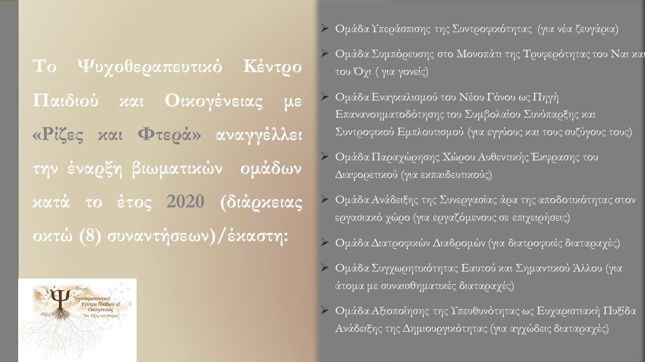 Το Ψυχοθεραπευτικό Κέντρο Παιδιού και Οικογένειας με «Ρίζες και Φτερά» υποδέχεται την νέα χρονιά αναγγέλλοντας την έναρξη νέων βιωματικών ομάδων (διάρκειας οκτώ (8) συναντήσεων)/έκαστη. Συγκεκριμένα:
